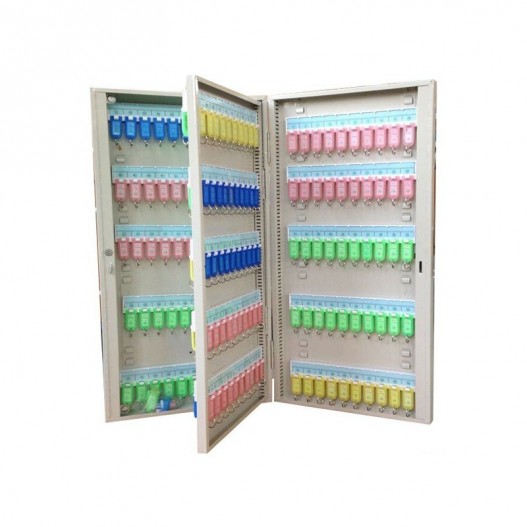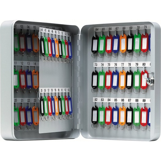 - Boîte de 90 clés  - Porte-étiquette -Visserie pour fixation murale- Tôle d'acier emboutie - Peinture vernis - Barrette d'accrochage réglable en hauteur - Bande d'indexation numérotée -Répertoire intégré -Serrure à barillet - 2 clés.
