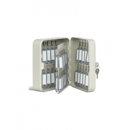 - Boîte de 45 clés  - Porte-étiquette -Visserie pour fixation murale- Tôle d'acier emboutie - Peinture vernis - Barrette d'accrochage réglable en hauteur - Bande d'indexation numérotée -Répertoire intégré -Serrure à barillet - 2 clés.