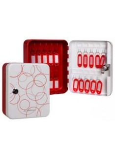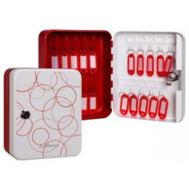Une boîte de 20 clés rouges, avec une porte-étiquettes et visserie pour fixation murale, Fabriquer en tôle d'acier emboutie, recouvert de peinture vernis avec une Barrette d'accrochage fixe, pastille d'identification adhésive numérotée et serrure à clé.