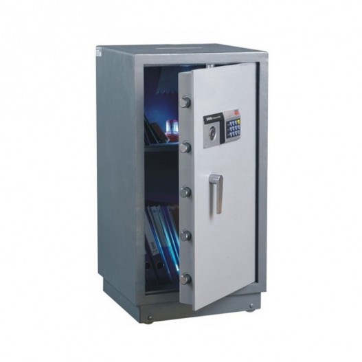 Coffre fort - 5 pênes ronds mobiles Φ 30 mm - Système d'ouverture et de fermeture électronique par code de 1 à 9 chiffres - 2 compartiments de stockage - Fente en haut pour déposer les enveloppes ou les billets sans ouvrir le coffre - Fente anti-hameçonnage - Équipé d'un dispositif de fixation mural - Dimensions: 45 x 40 x 76.5 cm - Poids: 86 Kg - Couleur Gris