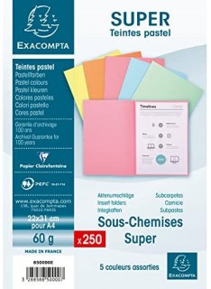 Paquet de 250 Sous chemise Exacompta - Format: 22 x 31 cm - Carte souple - Pour classer des documents non perforés ou perforés - Ecologiques car 100% recyclables - Poids: 60 g/m2 - Couleur: Assorties .