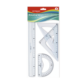 - Pochette géométrique - Règle 30cm - Equerre 60°/21cm -Equerre 45°/21cm - Rapporteur 180°/12cm - Couleur: transparente