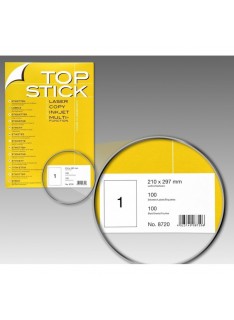 Etiquette blanche TOP STICK - Format: 297x210 mm - Étiquettes adhésives permanentes - Colle acrylique à base d'eau - Taille de la feuille: Din A4 - Nombre de feuilles par pack: 100 Feuilles - Nombre par feuilles: 1 - Couleur: Blanc.