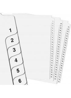 Les intercalaires sont en polypropylène souples , résistants et indéchirable d'épaisseur 1,2 mm . Ils sont au format A4 préimprimés de 1 à 6 sur 6 pièces de différents couleurs. Ils sont pré-perforés pour pouvoir être insérés dans un fichier, un dossier ou un classeur .