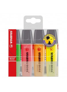 4xSurligneurs STABILO Boss Original - Pointe biseautée: de 2 à 5 mm - Encre à base d'eau - Rechargeable et indémodable avec sa forme unique - Ne sèche pas rapidement même si on oublie de remettre le capuchon immédiatement après utilisation : peut rester ouvert 4 heures sans sécher - Résistance intense à la lumière, sur tous les papiers : normal, fax et autocopiant - Couleur : Assorties .