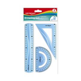 -Règle : 20 cm - Equerre : 60º - Rapporteur : 180ºx10cm - Matériau : plastique souple - Couleur: bleu Transparent