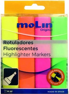 - Pochette de 4 Surligneurs MOLIN Viva - Encre fluorescente à base d'eau - Résistance intense à la lumière sur tout papier - Epaisseur de la méché : de 1à 5 mm - Couleurs Assorties (Rose, Vert ,Orange ,Jaune ).