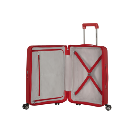 Valise à 4 roues (4 Roulettes) - Rigide - Matière :100% Polypropylène - Couleur: Rouge - Dimensions : 68x46x26cm - Dimensions extensibles : 68x46x26cm - Taille moyenne - Volume :73/81L - Poids :3kg - serrure à code TSA - Fermetures à glissière - 3 Poignées (haute, de portage, inferieure) - Poignée de traction en double tube - Porte-adresse intégré rétractable - Compartiment inférieur - Compartiment supérieur- Plateaux séparateurs - Sangle.